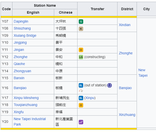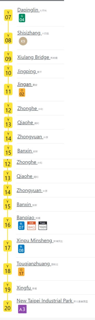The Circular Line of the Taipei Metro is a medium-capacity line serving as a loop line through sections of New Taipei City, traveling from Dapinglin south of Taipei City toward Banqiao in the southwest, turning north toward Sanchong in the west. Planned as a circular line, the first phase of the line’s construction focuses on the southwestern portion as this densely-populated area is under-served by metro services into the downtown. The Circular or Yellow line runs from Dapinglin to New Taipei Industrial Park and has a total of 14 stations. There are still stations undergoing construction, with estimated completion in 2029. Some Notable Stops on the Circular line include Dapinglin (connecting with the Songshan-Xindian), Jingan (connecting with the Zhonghe-Xinlu line), Bangqiao (Connecting with the Bannan Line), and New Taipei Industrial Park (Connecting with the Airport MRT). The current western terminus of the line is New Taipei Industrial Park, offering a transfer to the Taoyuan Airport MRT, running counter-clockwise to Touqianzhuang with an Orange Line transfer, Banqiao Station with a train and HSR transfer, Jingan Station with an Orange Line transfer, terminating at Dapinglin Station with a Green Line transfer. Unlike the other lines on the MRT, this line is still under construction, and there will surely be more changes to the line as more stations get added.