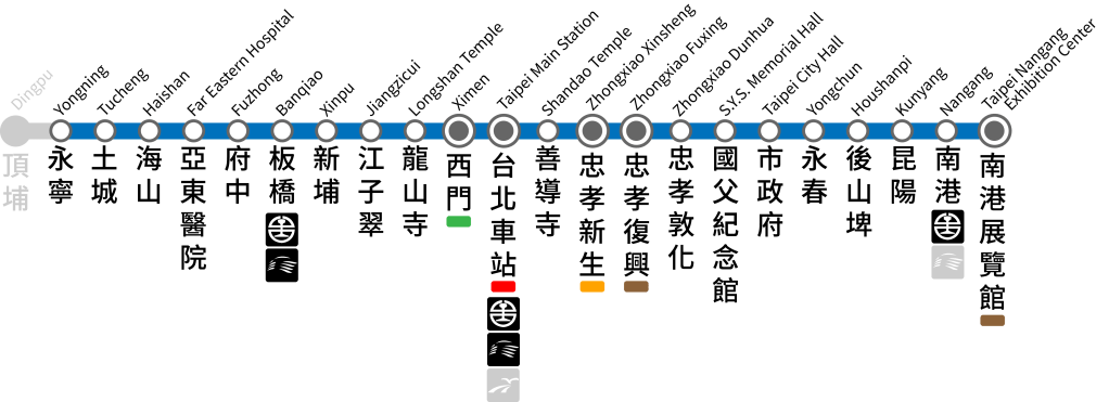 The Bannan Line, also known as the Blue Line, is one of the major lines of the Taipei Metro system in Taipei, Taiwan. The Bannan Line runs from Nangang Exhibition Center Station in the east to Dingpu Station in the southwest. It covers a significant portion of Taipei City and extends into New Taipei City. The Bannan Line serves a total of 24 stations along its route. Some notable stations include Taipei Main Station (a major transportation hub), Zhongxiao Xinsheng (near Taipei’s eastern commercial district), Zhongxiao Fuxing (a busy shopping area), and Ximen (connecting to the Songshan-Xindian Line). The Bannan Line intersects with other lines of the Taipei Metro system at various stations, facilitating easy transfers between different lines. For example, passengers can transfer to the Songshan-Xindian (Green) Line at Ximen Station, Tamsui-Xinyi (Red) Line at Taipei Main Station, as well as the Wenhu (Brown) Line at both Zhongxiao Fuxing and Taipei Nangang Exhibition Center. The Bannan Line serves as one of the primary east-west routes of the Taipei Metro system, connecting eastern and western parts of Taipei City. It provides commuters with access to key areas such as commercial districts, educational institutions, and residential neighborhoods. Ximending is a popular shopping street in the Wenhua District of Taipei, Taiwan; it is known as the “Harajuku of Taipei” and is a popular destination for shopping, entertainment, and dining. Many tourist also enjoy stopping by the Sun Yet-Sen Memorial Hall, which pays tribute to Sun Yet Sen.