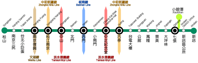 The Songshan-Xindian Line, also known as the Green Line, is one of the primary lines of the Taipei Metro system in Taipei, Taiwan. The Songshan-Xindian Line runs from Songshan District in the east to Xindian District in the southwest. It covers a diverse range of neighborhoods and districts within Taipei City and New Taipei City. The Songshan-Xindian Line serves a total of 24 stations along its route. Some of the notable stations include Songshan (near Songshan Airport), Zhongxiao Xinsheng (close to Taipei Arena), Gongguan (near National Taiwan University), and Xindian (the southwestern terminus). The Songshan-Xindian Line intersects with other lines of the Taipei Metro system at various stations, allowing passengers to transfer easily between different lines. For example, passengers can transfer to the Tamsui-Xinyi Line at Nanjing Fuxing station for the Wenhu (Brown) Line, Sangjiang Nanjing and Guiting for the Zhonghe-Xinhu (Orange) line, Zhongshan and Chiang Kai-Shek Memorial Hall for the Tamsui-Xinyi (Red) line, Ximen for the Bannan (Blue) line, as well as Dapinglin station for the Cirle (Yellow) line. The Songshan-Xindian Line serves as a crucial transportation artery, connecting the eastern and southwestern parts of Taipei City and New Taipei City. It provides commuters with access to key areas of the city, including commercial districts, educational institutions, and residential neighborhoods. The popular Raohe Night Market is located in the Songshan District and is easily accessible from the Songshan MRT station.