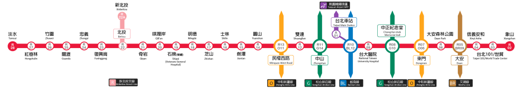 The Tamsui-Xinyi Line, also known as the Red Line, is one of the major lines of the Taipei Metro system in Taipei, Taiwan. The Tamsui-Xinyi Line runs from Tamsui District in the north to Xinyi District in the south. It covers a significant portion of Taipei City, passing through various districts such as Beitou, Shilin, Zhongshan, and Daan. The Tamsui-Xinyi Line serves a total of 29 stations along its route. Some of the notable stations include Tamsui (the northern terminus), Beitou (known for its hot springs), Shilin (home to the famous Shilin Night Market), Zhongshan (near Taipei Main Station), and Taipei 101/World Trade Center (serving the iconic Taipei 101 skyscraper). The Tamsui-Xinyi Line intersects with other lines of the Taipei Metro system at various stations, allowing passengers to transfer easily between different lines. For example, passengers can transfer to the Wenhu (Brown) Line at Daan Station, Zhonghe-Xinlu (Orange) Line at Dongmen, Bannan (Blue) Line at Taipei Main Station, and Chiang Kai-Shek Memorial Hall for the Songshan (Green) line . The Tamsui-Xinyi Line serves as one of the primary north-south routes of the Taipei Metro system, connecting the historic district of Tamsui with the modern commercial and business district of Xinyi. It provides commuters with access to key areas of the city, including shopping centers, cultural attractions, and residential neighborhoods. If you are visiting Tamsui, it is well connected by local bus services and you could even take a ferry over to Bali or the Fisherman’s Wharf as well. Tamsui also has it’s own light rail system, that is a different system from the Taipei Metro entirely. Two other popular attractions on the Tamsui-Xinyi line is Chiang Kai Shek Memorial Hall and Daan Park.