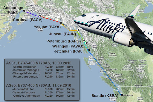 Flight 65: Seattle (7:55 a.m.)-Ketchikan-Wrangell-Petersburg-Juneau-Anchorage (3:08 p.m.)