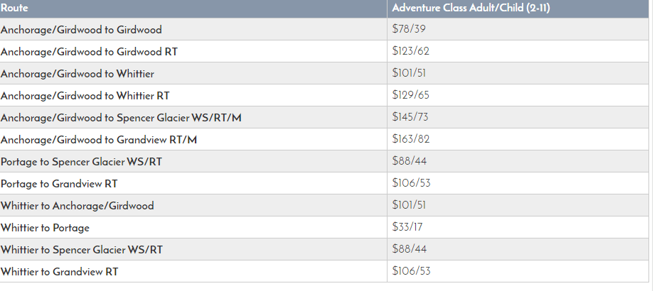 Staying on the train has its appeal, however, as Bartlett Glacier and Trail Glacier come into view. Many consider this the most scenic stretch of track, as the train winds along the Placer River Valley and amid the alpine meadows of Grandview. On the return journey, Grandview and Spencer passengers have the option to disembark at Portage for a motorcoach transfer to Alyeska Resort (in Girdwood) or Anchorage Depot, thus saving a return trip to Whittier (and about 2 ½ hours of travel time). A variety of destinations and a convenient round-trip schedule make the Glacier Discovery Train ideally suited for day trips from Anchorage. Traveling south from Anchorage, the train makes a brief stop in Girdwood, before continuing on to Whittier, Portage, the Spencer Glacier Whistle Stop and Grandview. On the return journey, Anchorage and Girdwood-bound passengers may opt to disembark at Portage 2 for a direct motorcoach transfer, or stay on the train for the more lengthy journey including a stop in Whittier. Use the table below to check the prices for the Glacier Discovery Route.