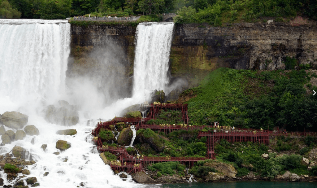 Cave of the Winds is an iconic attraction takes visitors on a wooden walkway behind the American Falls, offering incredible close-up views and the chance to feel the spray of the mist. Cave of the Winds tickets can be purchased at the Cave of the Winds on Goat Island OR the Ralph C. Wilson Welcome Center. As the Cave of the Winds is a timed ticketed attraction, plan to make it your first stop of the day to make your reservation! The Cave of the Winds trip takes you closer to the waters of Niagara Falls than you thought possible. You ride an elevator 175 feet (53 meters) deep into the Niagara Gorge. Then, clad in a bright yellow poncho and wearing the special footwear provided, you follow a tour guide over a series of wooden walkways to the famous “Hurricane Deck”. As you stand at the railing, you are a mere 20 feet (6 meters) from the billowing torrents of Bridal Veil Falls. The rushing waters loom above you, dousing you with a generous spray as you face the thundering Falls head-on. Rainbows are usually visible day and night. Everyone can experience the sights of Niagara Falls. A deck has been built 150 feet from the base of the Falls especially designed for handicapped and adults with children in arms.