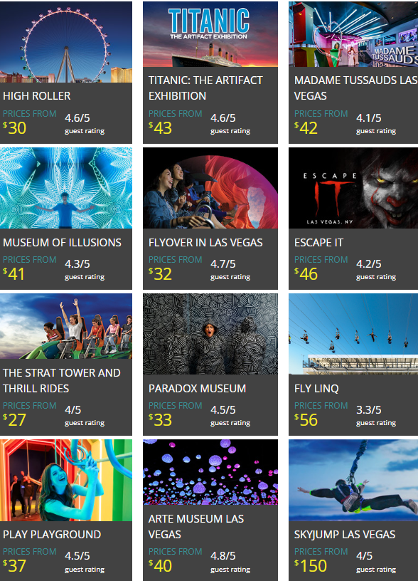 Vegas.com offers admission tickets to a variety of attractions, shows, and tours in Las Vegas. You can explore options for popular attractions like the High Roller Observation Wheel, Madame Tussauds, or even helicopter tours over the Strip. They also provide discounted tickets for many experiences, helping you save while enjoying the best of Vegas. To browse and book tickets, visit their attractions page.