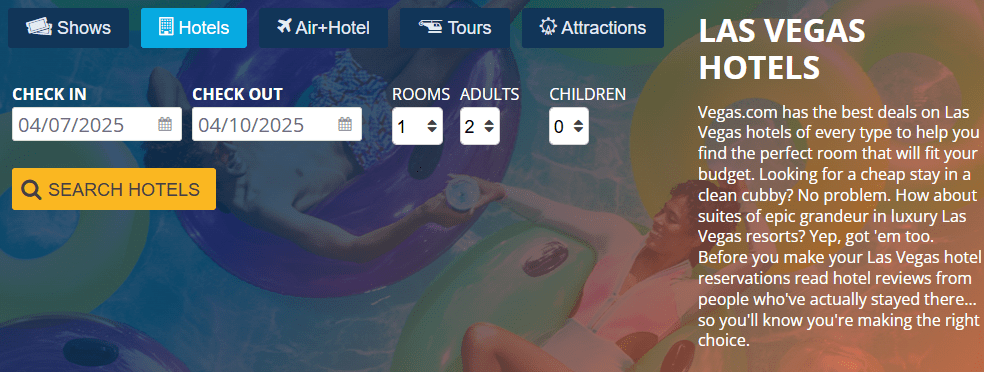 Vegas.com offers a variety of hotel deals in Las Vegas, catering to different budgets and preferences. You can explore more options and book directly on Vegas.com. Let me know if you’d like help narrowing down your choices!