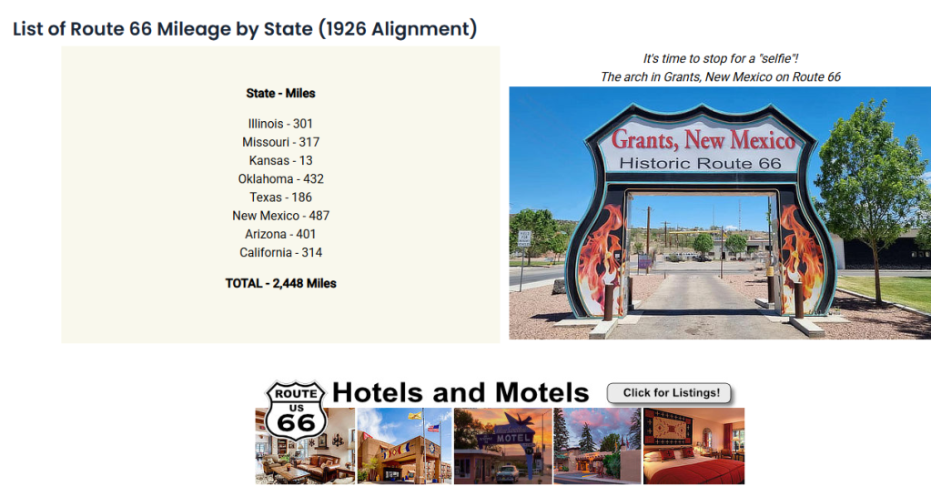 Today, in 2025, several states recognize the historical significance of the road, and have it marked with “66” in the state highway number. “Historic Route 66 Associations” are active in several states. The road is also a major tourist attraction, so many states openly market attractions and lodging along the old route. The old road still traverses dozens of small towns with vintage gas stations, quirky tourist attractions, diners, “Mop & Pop” motels, historic sites & museums, stunning vistas, and gift shops.