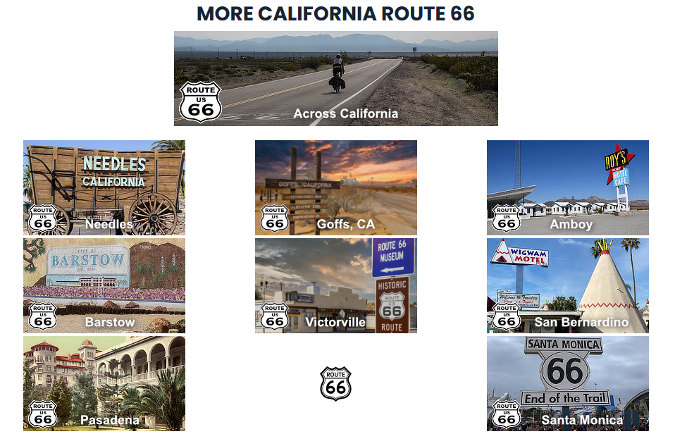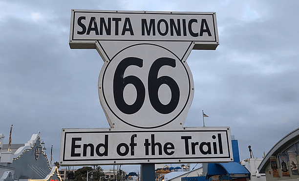 Elmer’s Bottle Tree Ranch (Helendale) is a whimsical forest of “trees” made from glass bottles and vintage items. Roy’s Motel and Café (Amboy) is an iconic Route 66 stop with a retro vibe, set against the Mojave Desert. Amboy Crater is an extinct volcano offering hiking trails and stunning desert views. Calico Ghost Town is a well preserved mining town with tours, shops, and a taste of the Old West. Cucamonga Service Station is a beautifully restored gas station from the early days of Route 66. The original terminus of U.S. Route 66 was at 7th and Broadway in downtown Los Angeles. However, over the years, and decades, Route 66 has had several “official” and “unofficial” ending points. The route was later extended to the intersection of Lincoln and Olympic boulevards in Santa Monica Pier, about one mile from the Pacific Ocean. This is often referred to as the official ending point of Route 66, with ocean views and classic boardwalk attractions.