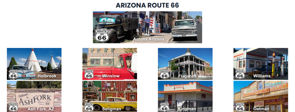 Explore ancient petrified wood and colorful badlands of Petrified Forest National Park near Holbrook. Stay in the retro motel, Wigwam Motel, shaped like teepees, a classic Route 66 experience in Holbrook. Visit one of the best-preserved meteor impact sites in the world, Meteor Crater in Winslow. Standin’ on the Corner Park is a tribute to the Eagles’ song “Take It Easy,” complete with a statue and mural. Discover the ruins of Two Guns Ghost Town, a once-thriving tourist stop with a fascinating history. Williams is a charming town in Arizona known as the “Gateway to the Grand Canyon,” this town is full of Route 66 nostalgia.