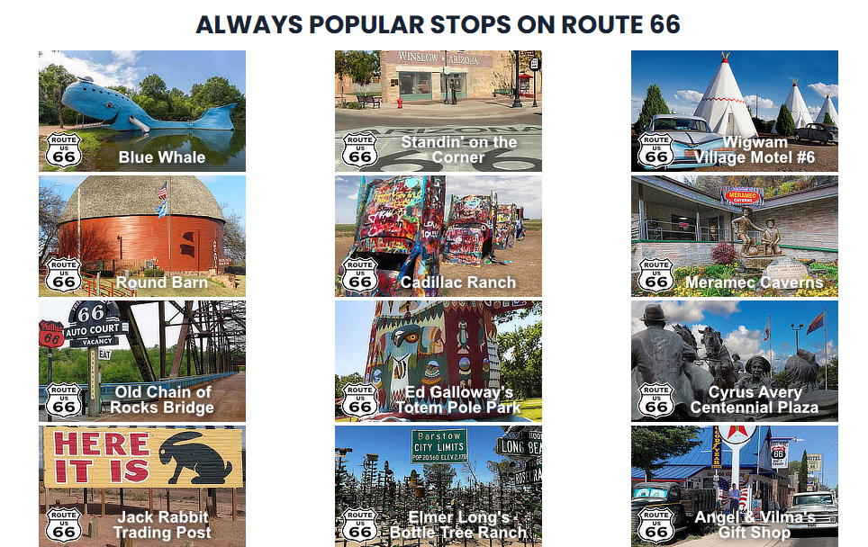 Route 66 became one of the most famous roads in the United States, outdistancing others such as the Lincoln Highway. It is popular lore in movies, songs, books like “The Grapes of Wrath”, and TV shows. The legendary highway was known far and wide for its variety of “mom and pop” motels, neon lights, drive-ins, quirky roadside attractions, flat tires, cars with no air conditioning, dangerous curves, steep hills, and narrow lanes. Today, there are more than 250 buildings, bridges, road alignments and other sites along Route 66 that are listed on the National Register of Historic Places. The movie “Easy Rider” was filmed at several locations along Route 66. The move “Thelma and Louise” also featured Route 66 references and scenes. The popularity stuck, and continues to grow today.