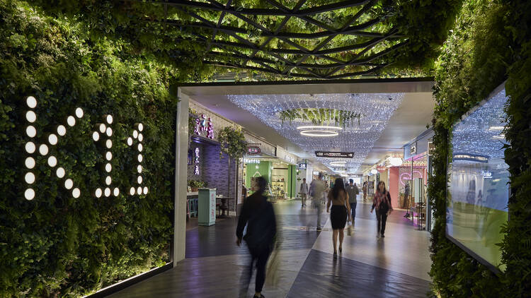 The mall integrates food with ambiance—cafés, gelato stands, and noodle bars are woven into the architectural narrative.