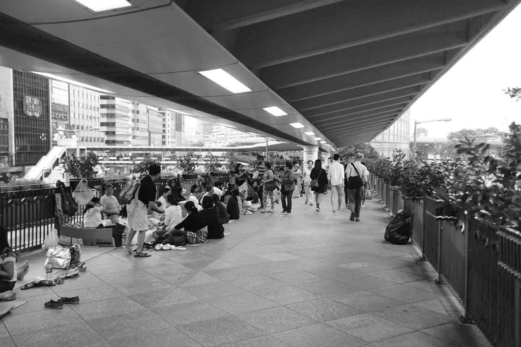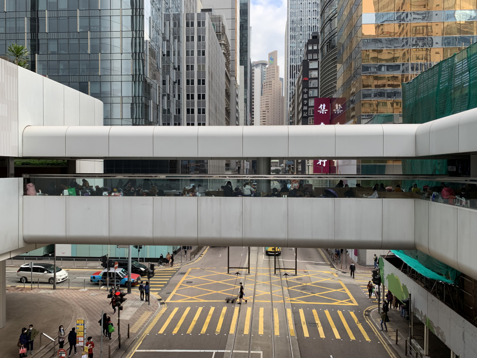 Navigating the labyrinth of elevated walkways in Central is not as difficult as one may think, as users can always rely on the clear signage and street scenes below to orient themselves. Elevated several metres above ground, the walkways offer a unique vantage point to enjoy the urban scenery of the financial district. Every Sunday, the covered elevated walkways and adjoining podiums would be turned into a gathering point for foreign domestic helpers in Hong Kong. Sitting in small groups on folded cardboard, the domestic helpers (mainly from Philippines and Indonesia) would gather and eat, chat, pray, dance, sing karaoke, tell jokes, watch smartphone videos, play card games, make long distant video calls, etc. The walkways where normally dominated by quick pace pedestrians would suddenly become a vibrant social hub as if a public park.