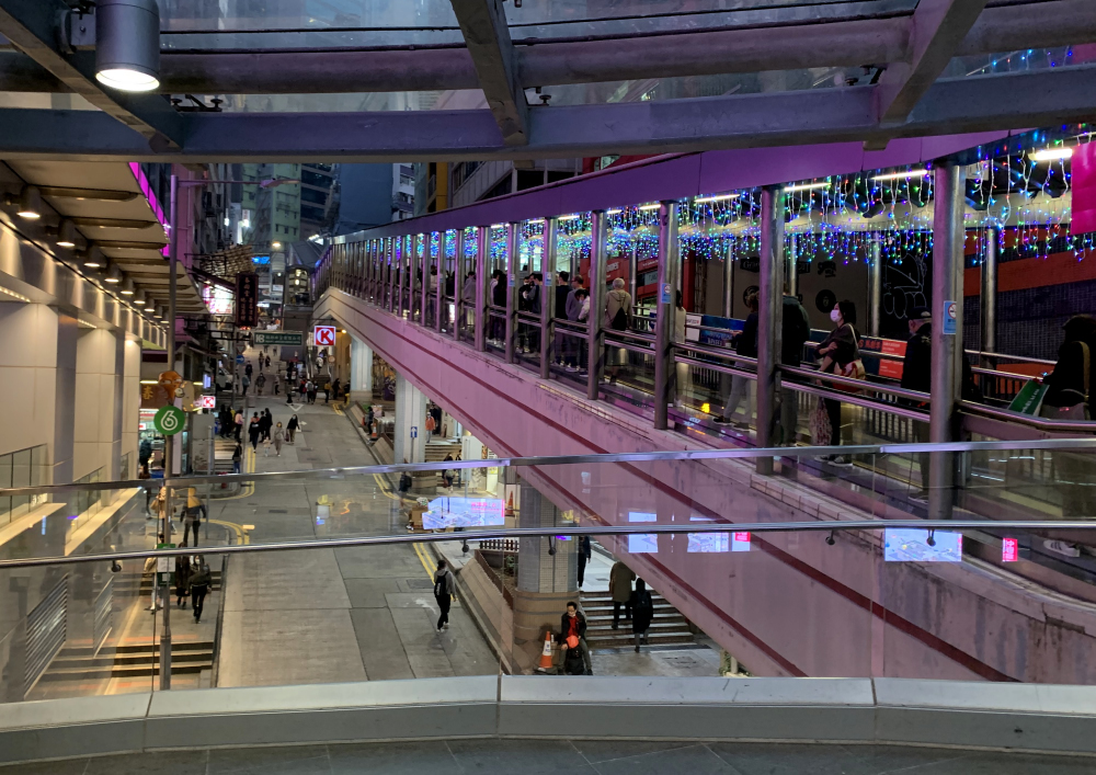 The design language of many walkways—glass, steel, and polished surfaces—can feel corporate and repetitive, lacking the texture and spontaneity of street-level Hong Kong.