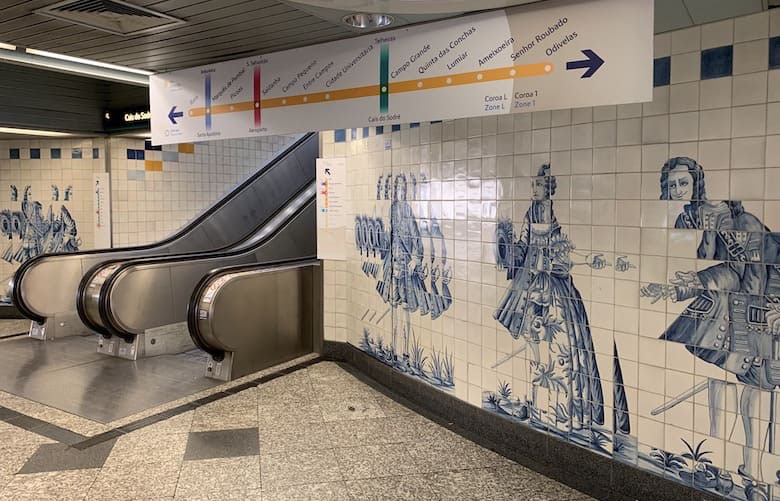 The blue line is the one most used by tourists, as it goes down Avenida da Liberdade to Baixa and the train station of Santa Apolónia. The green line is also popular, especially its stops in Rossio Square and Cais do Sodré station. The red line connects the Parque das Nações district and the airport to the other lines. The yellow line is mostly used by locals, as it heads north, away from the main tourist areas. Major Stations include Baixa-Chiado, Marquês de Pombal, Cais do Sodre, Campo Grande, and Oriente. Artistic projects decorate most of the stations, including themed tiled walls by contemporary artists. The red line is the most impressive, but other stations of this underground gallery feature works by prominent Portuguese artists: Vieira da Silva in Rato and Cidade Universitária, Júlio Pomar in Alto dos Moinhos, and Maria Keil in most of the stations of the green and yellow lines.
