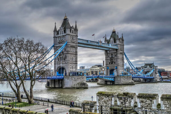 The Victorian engineering of Tower Bridge contrasted with the post‑2000 skyline.
