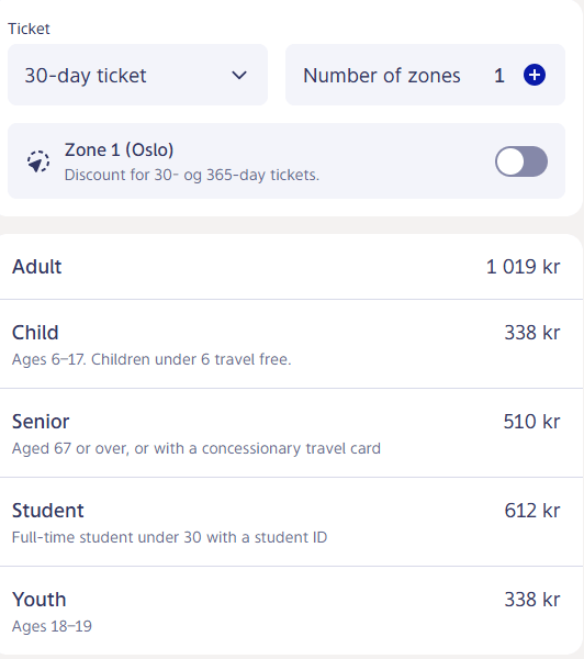As of early 2026, most visitors only need Zone 1, which covers the entire city of Oslo and all metro stops.