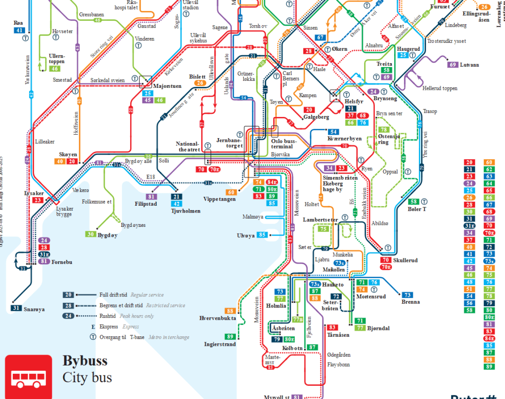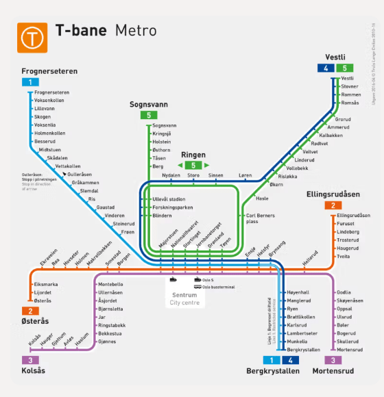 Metro (T-bane): Five color-coded lines, all passing through the city center (Nationaltheatret and Jernbanetorget/Oslo S).