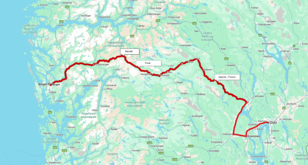 on whether it is a day or night service. The line features 182 tunnels, including the 10.3 km Finsetunnelen, and took 15 years (1894–1909) to build. Service is operated by Vy, with about 5 to 6 daily departures, including an overnight sleeper train. When traveling from Bergen to Oslo, the right-hand side is often recommended for the best mountain views. Booking in advance via the Vy website can secure significantly cheaper “Minipris” tickets compared to buying on the day of travel.